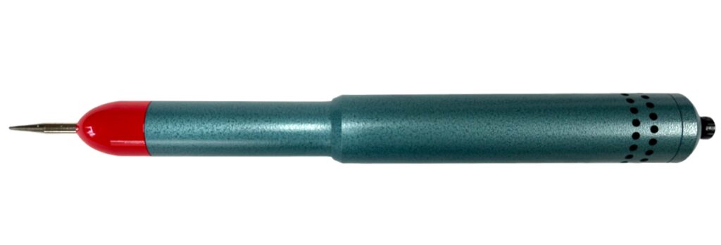 高周波式の携帯型ピンホールテスターです。本体先端の電極から高周波電圧が発生、ピンホールが存在する場合はそこへ向かって線状に放電するため、目視で検知ができます。